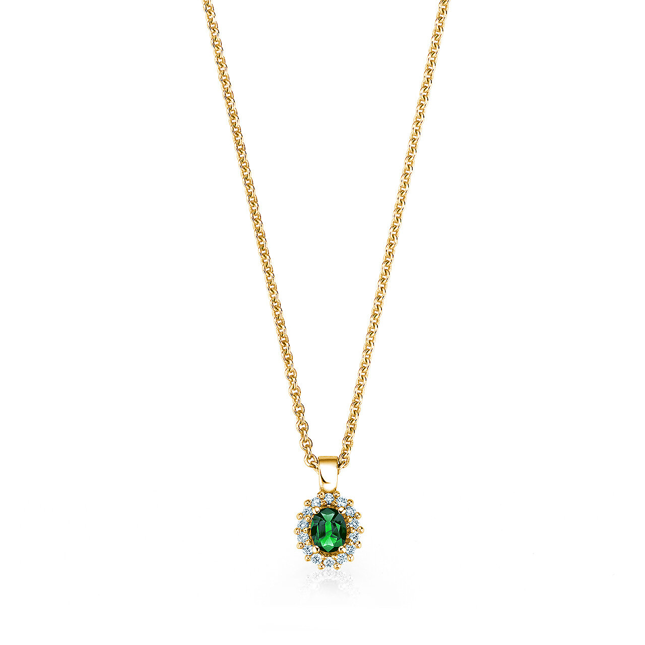 Der beliebte Anhänger Jolie ist mit Saphir, Smaragd oder Rubin erhältlich und verziert mit einem Kranz hell funkelnder Diamanten.