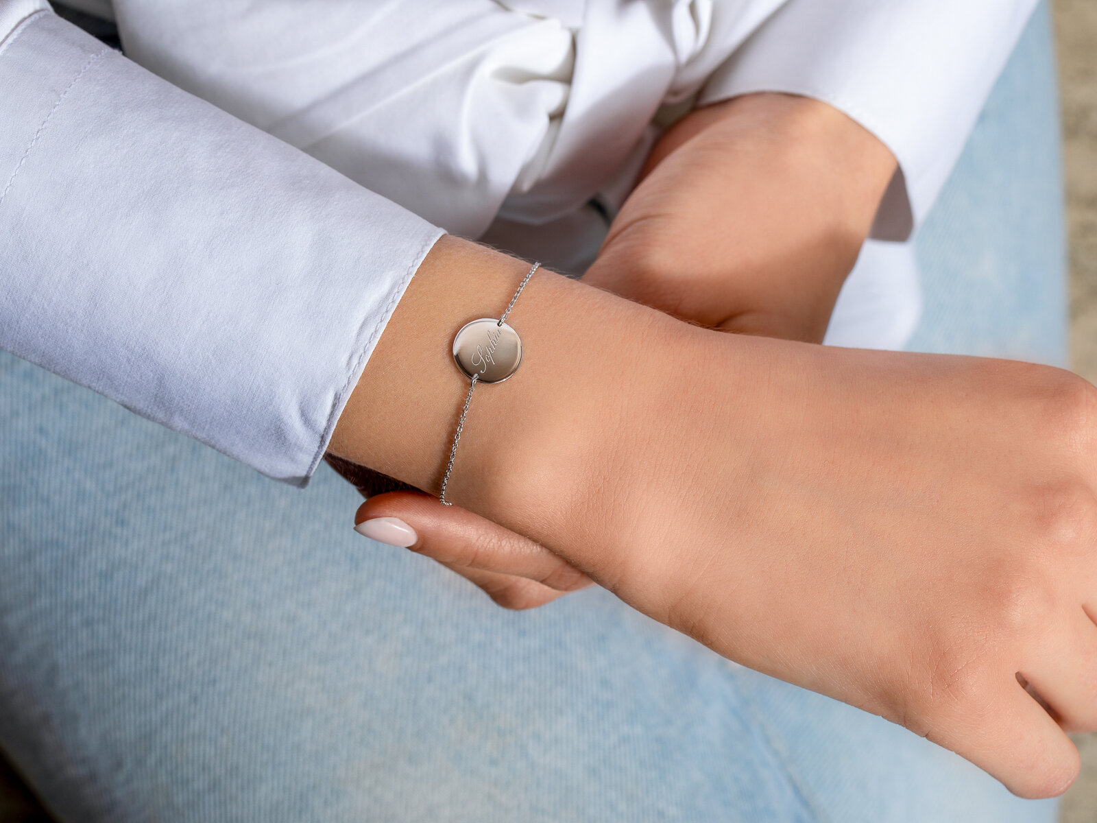 Ein Armband mit rundem Gravurplättchen – Symbol für Sonne und Lebensfreude. Das zauberhafte Schmuckstück wird gerne von Menschen getragen, die die Initialen des Kindes oder des Partners immer bei sich haben wollen. Ein wunderbares Geschenk für Jubiläen, Geburtstage und zu festlichen Anlässen.