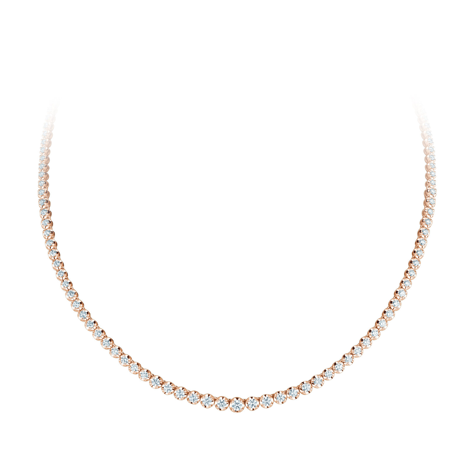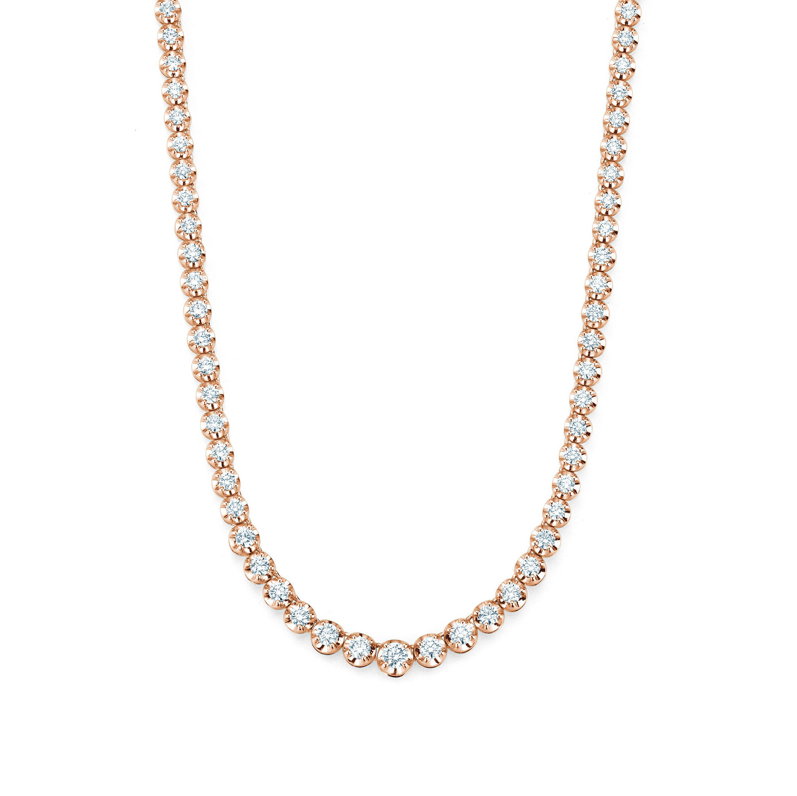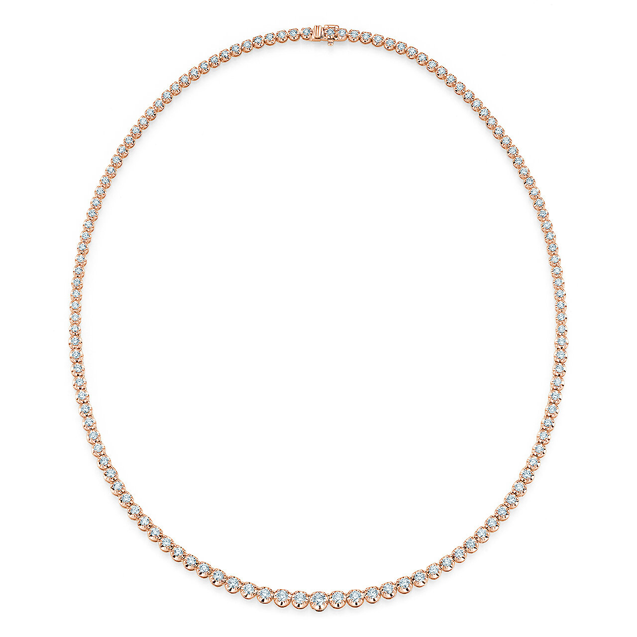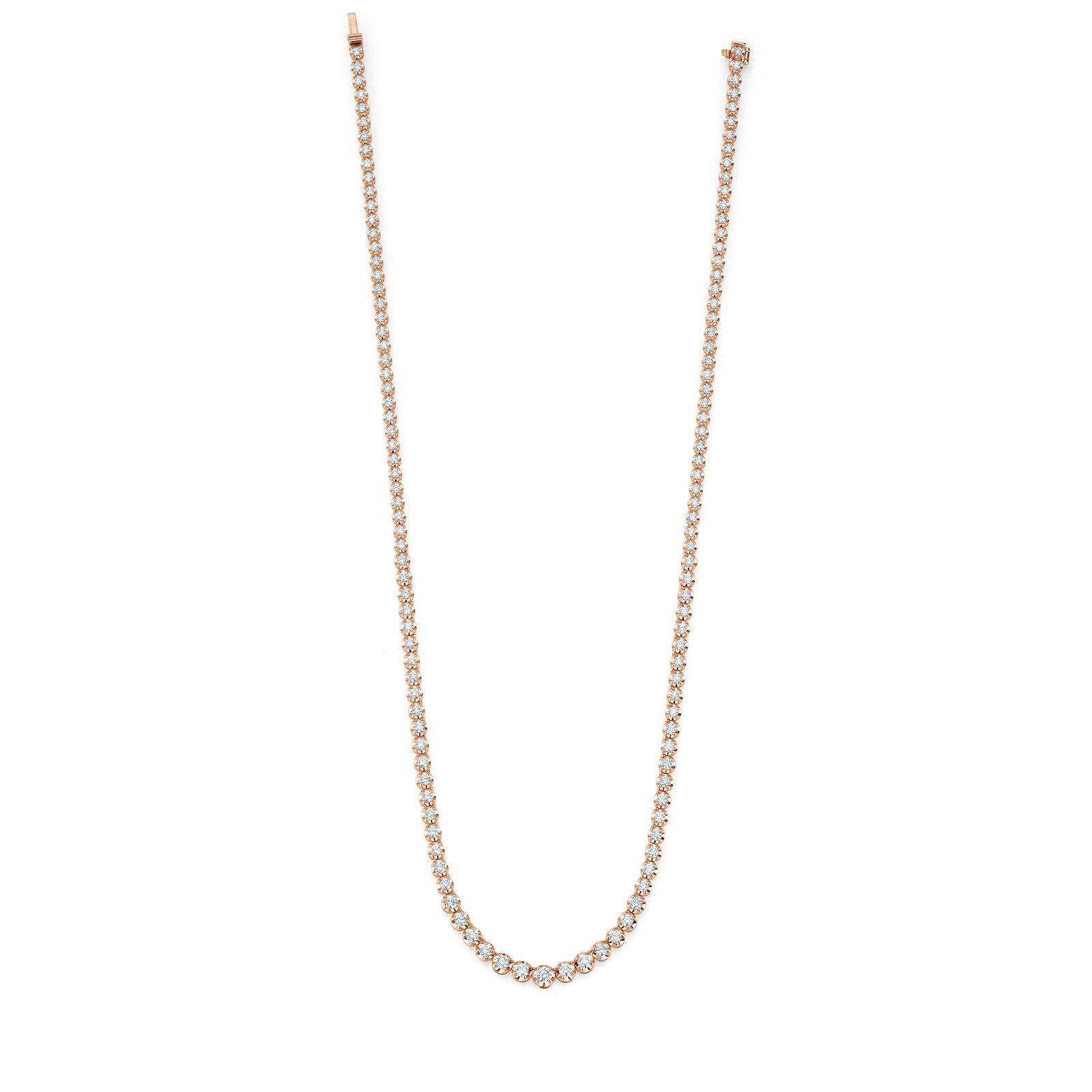 Das klassische Tennis-Collier ist komplett mit Diamanten gefasst, die zur Mitte hin größer werden.