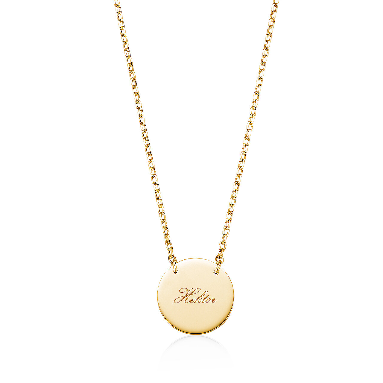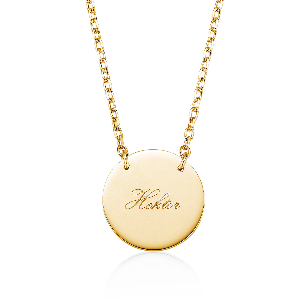 Eine Halskette mit mit rundem Gravurplättchen – Symbol für Sonne und Lebensfreude. Das zauberhafte Schmuckstück wird gerne von Menschen getragen, die die Initialen des Kindes oder des Partners immer bei sich haben wollen. Ein wunderbares Geschenk für Jubiläen, Geburtstage und zu festlichen Anlässen.