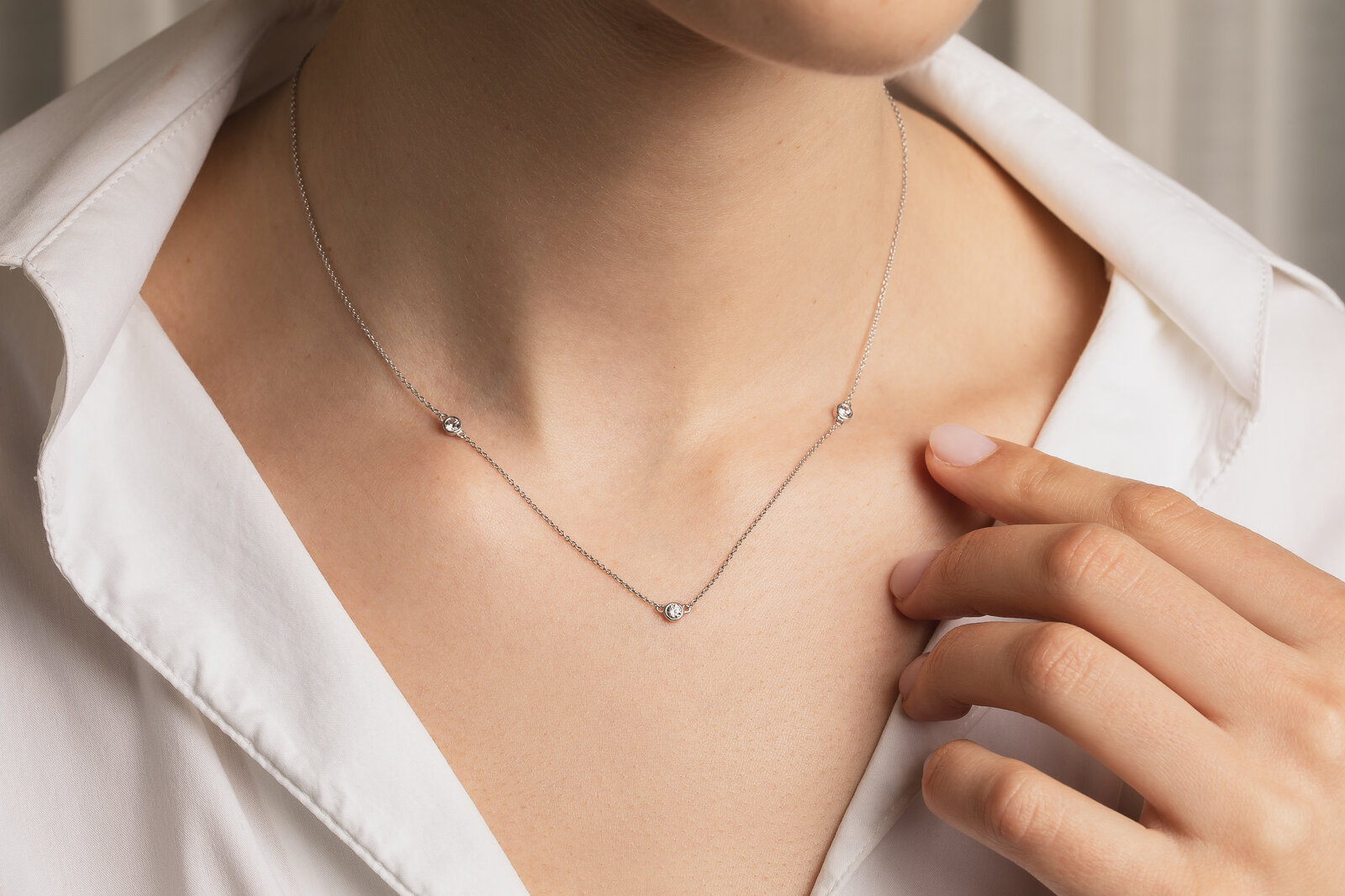 Zur Auswahl stehen Ketten mit einem, drei oder fünf Diamanten. Die Ketten sind in fünf Diamantgrößen und aus Weißgold, Gelbgold oder Roségold erhältlich.