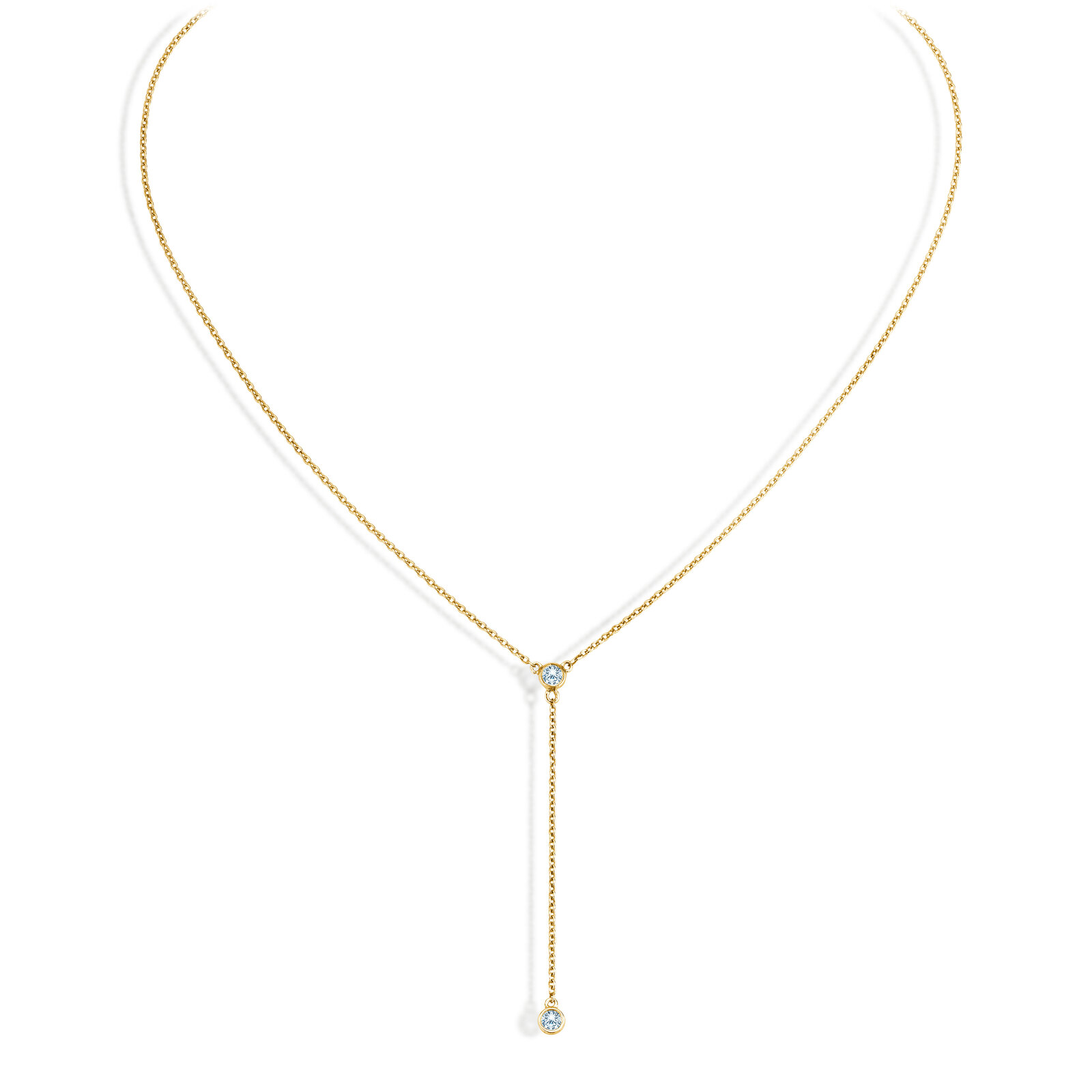 Der Halsschmuck verzaubert mit zarter Eleganz und zwei Diamanten. Der obere der beiden runden Edelsteine verbindet als zentrales Element Halskette und Anhänger.