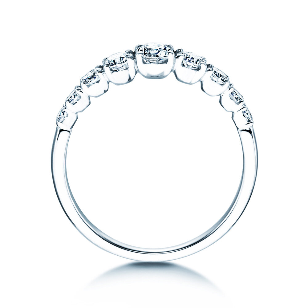 Jetzt entdecken: Das ausgewogen und elegante Modell 9 Diamonds ist mit neun funkelnden Diamanten unterschiedlicher Größe besetzt, die zur oberen Mitte der Ringschiene hin stetig größer werden.