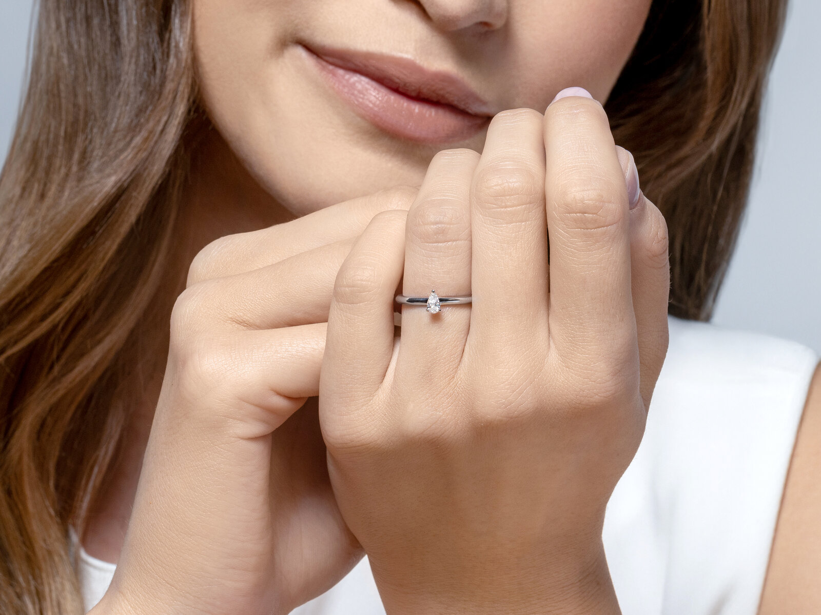 Der tropfenförmige Pear Cut wirkt besonders filigran und streckt optisch den Finger. Durch seine facettenreiche Schliffform reflektiert der Diamant das Licht intensiv und entfaltet in der zarten Fassung dieses Verlobungsrings ein außergewöhnlich lebendiges Funkeln.
