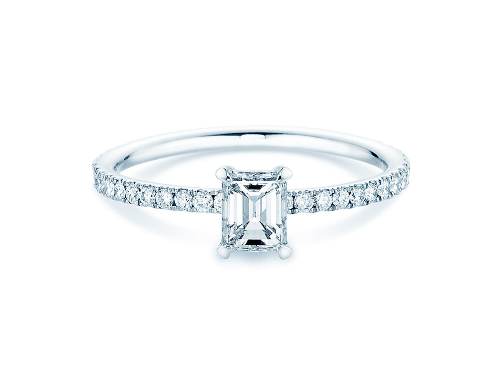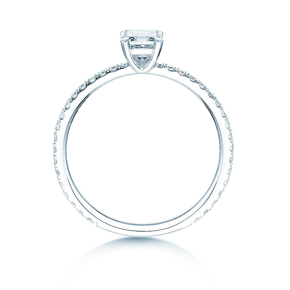 Prachtvoll präsentiert sich das Modell Elaine in schimmerndem Finish. Der imposante Halbkaräter im Emerald-Schliff wird zu beiden Seiten flankiert von je 18 kleineren Diamanten. Die so gebündelte Leuchtkraft schenkt diesem Ring seine feminine Ausstrahlung.