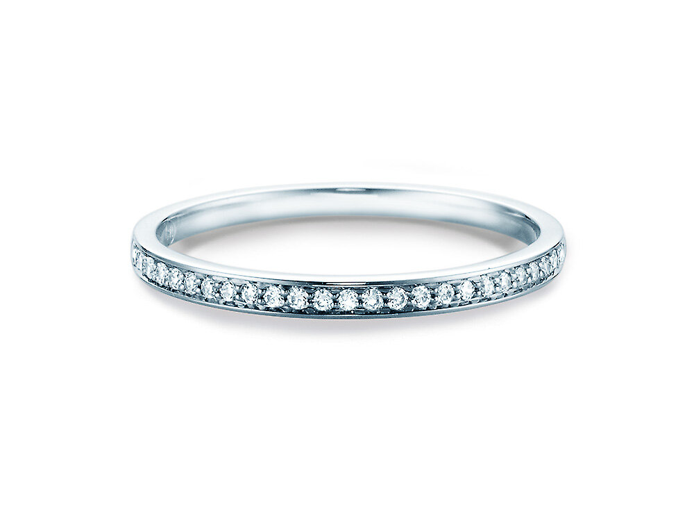 Ein leuchtendes Band aus Diamanten ziert die gesamte obere Hälfte dieses schlichten Alliance-Rings. Mit dem strahlenden Funkeln der Diamanten und seinem zeitlosen Design lässt sich dieser Alliance-Ring perfekt mit anderen Ringen kombinieren.