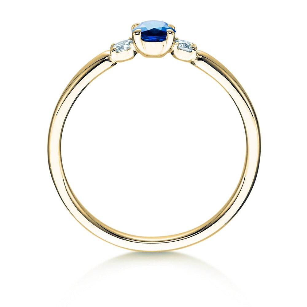 Zwei zarte Diamanten schmiegen sich eng an den Hauptstein aus blauem Saphir in 0,08 Karat. Stilvolle Brillanz trifft auf ein romantisches, tiefblau schimmerndes Versprechen. Sicher gehalten in einer Fassung mit vier Krappen erstrahlen die drei Edelsteine. Die Diamanten in Brillantschliff überzeugen durch funkelnde Facetten, der Saphir durch sein königliches Blau. Ein Meisterwerk!