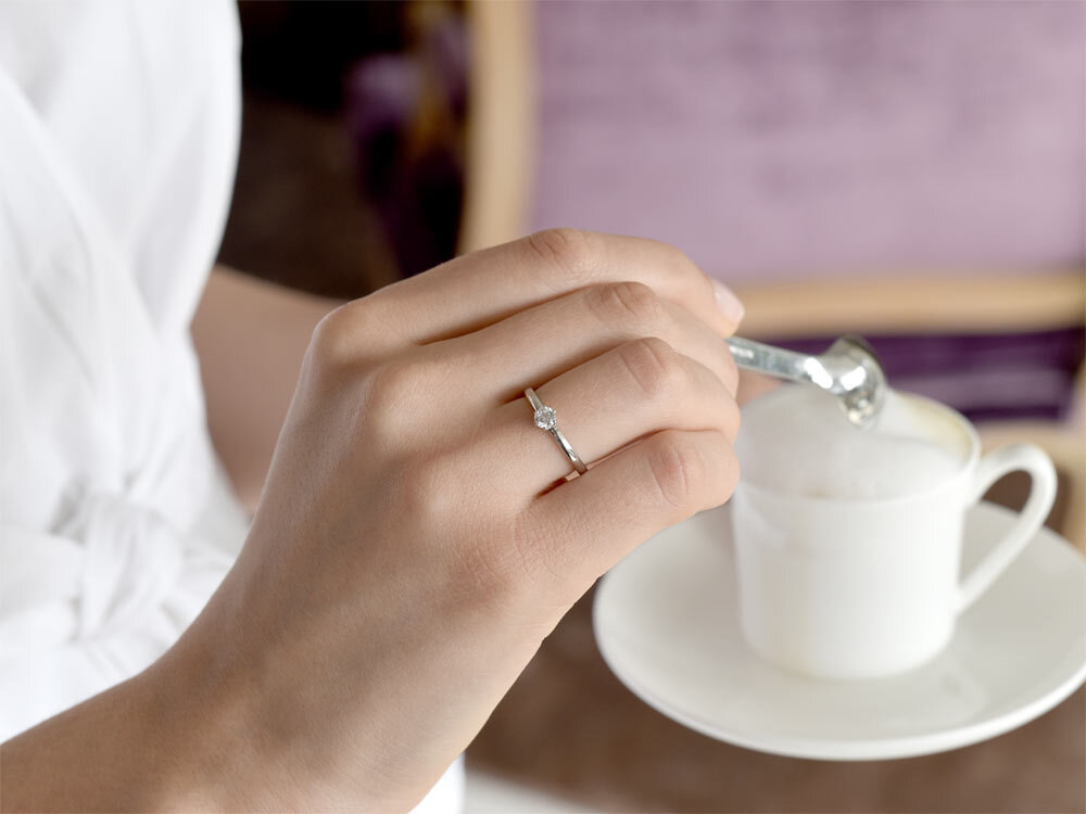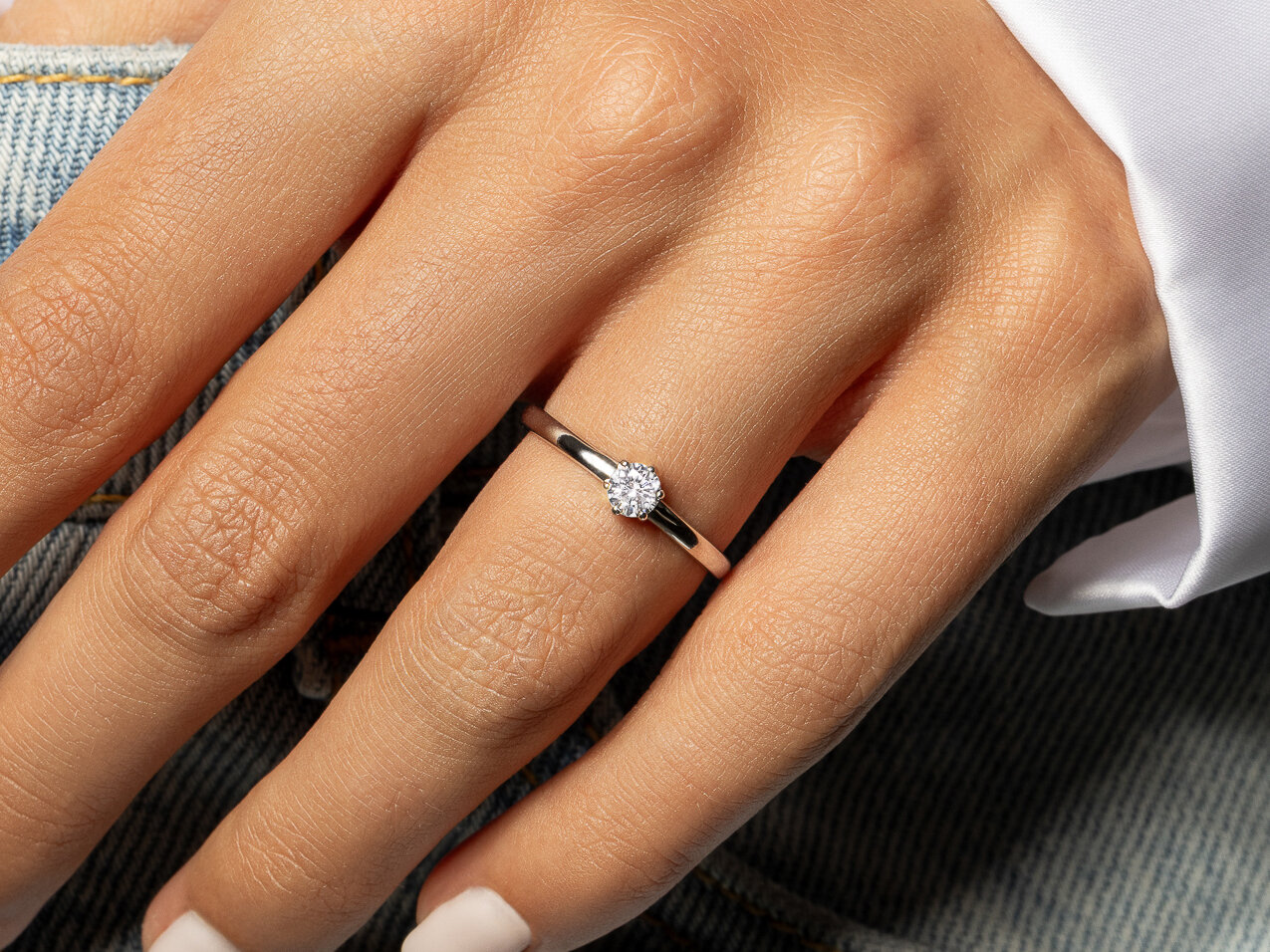 Der Solitärring Melody kommt auf den ersten Blick ganz klassisch daher. Im Detail gelingt es ihm aber mühelos zu überraschen. Die Fassung des Melody rahmt harmonisch den Mittelstein, einen hochwertigen Diamant. Beim Design haben wir uns darauf konzentriert, dass die Ringschiene nicht zu hoch ist. Das Modell Melody ist der perfekte Solitärring für alle, die einen Solitärring suchen, der nur minimal aufgesetzt ist.