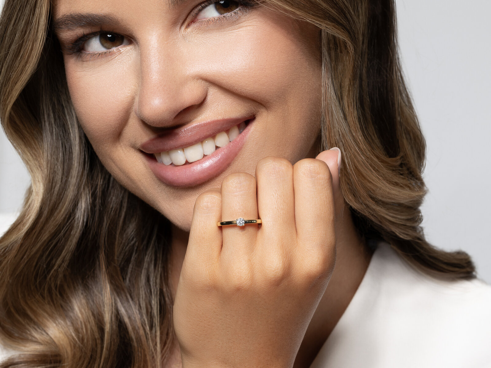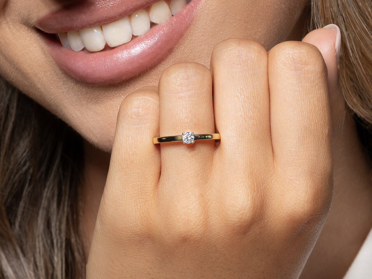 Solitärring Modern Petite mit echtem Diamant und vierer Krappenfassung. Durch die dezente Fassung des Solitärring Modern Petite kann sich das Licht im Diamanten exzellent brechen.