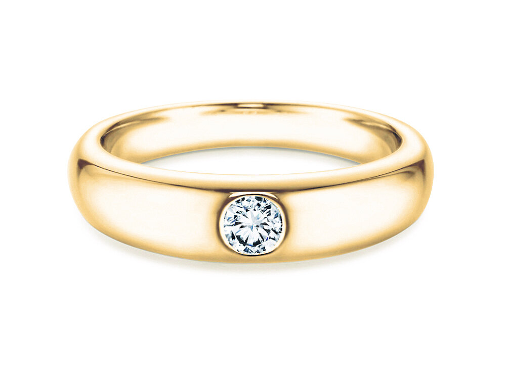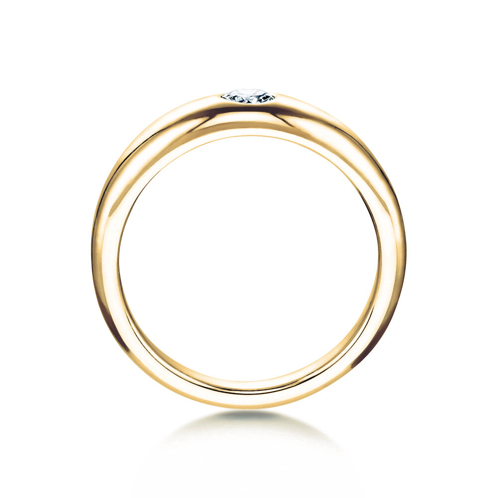 Die Ringform ist schlicht und klassisch – vielleicht könnte man sie als die klassische Ringform schlechthin bezeichnen. Die abgerundete Außenseite wird betont durch einen dezent in die Ringschiene eingearbeiteten Diamanten, der das Modell Promise zu einem echten Highlight macht. Der leuchtend helle Diamant wird geschützt durch die Ringschiene.