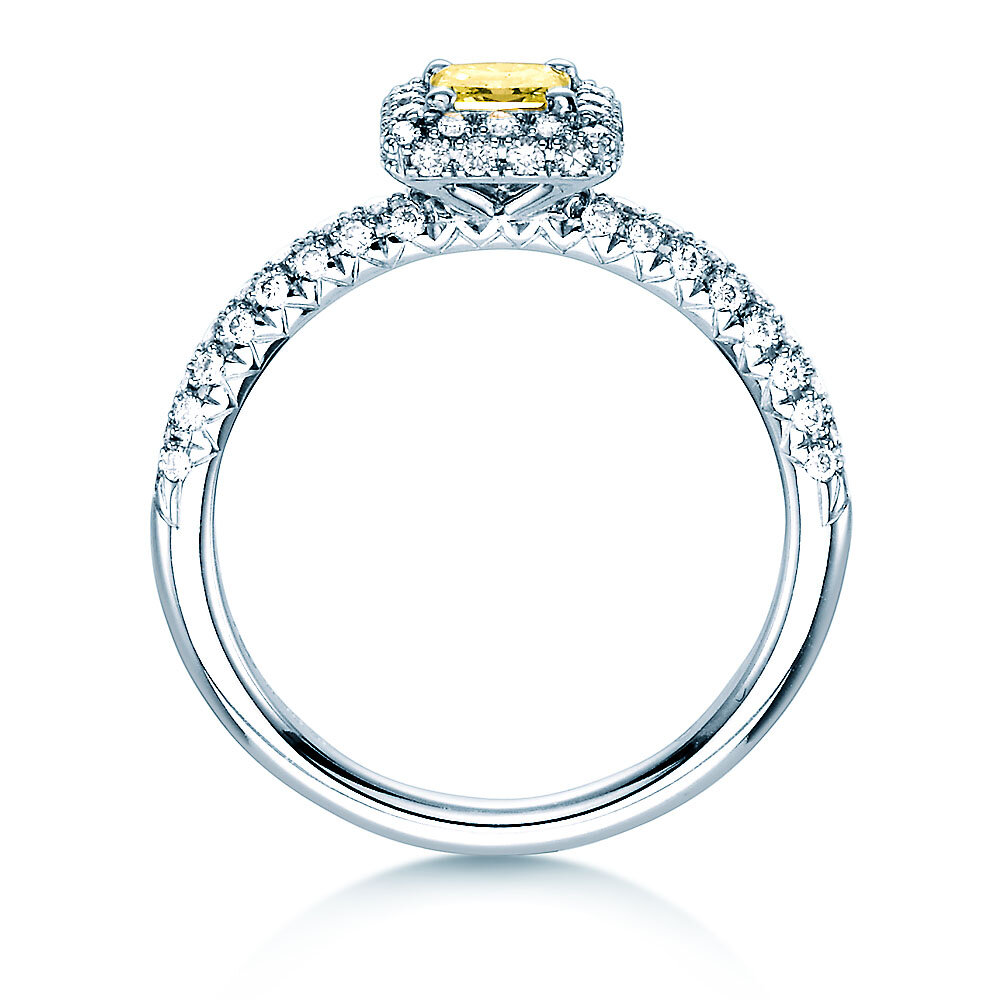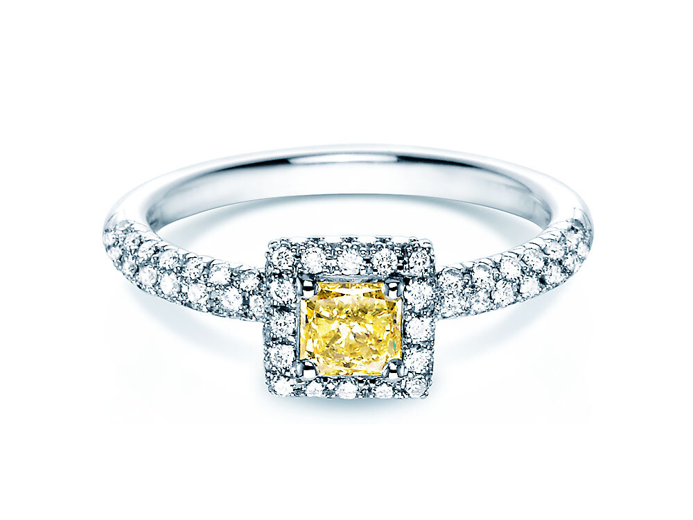 Gegensätze ziehen sich an. Der ausdrucksvolle quadratische gelbe Diamant in Princess-Schliff wird von den weißen Brillanten lieblich umrundet. Ein herausragender Ring für eine Frau, die einen ausdrucksvollen Charme besitzt.