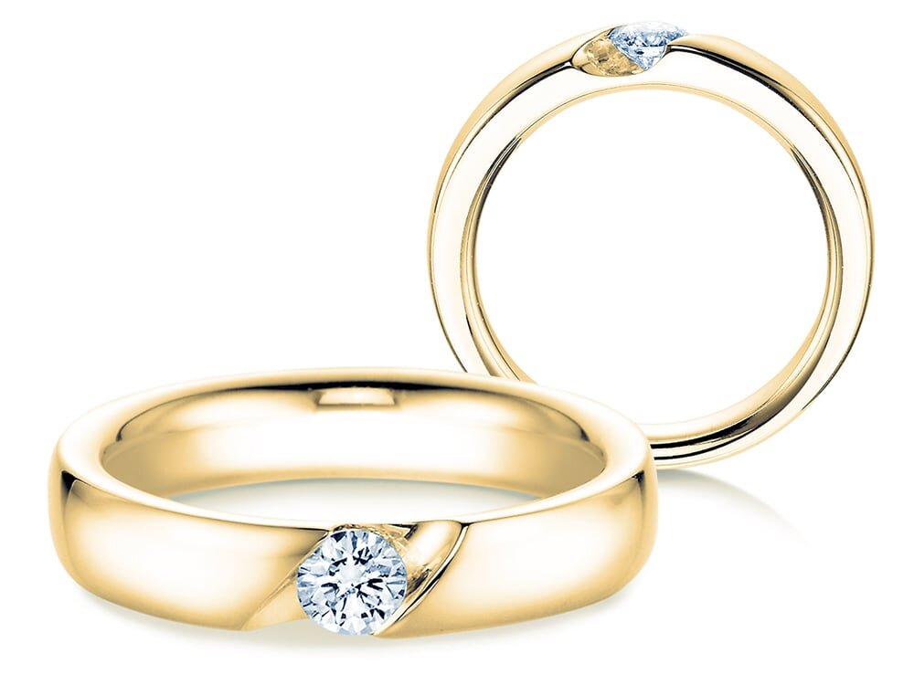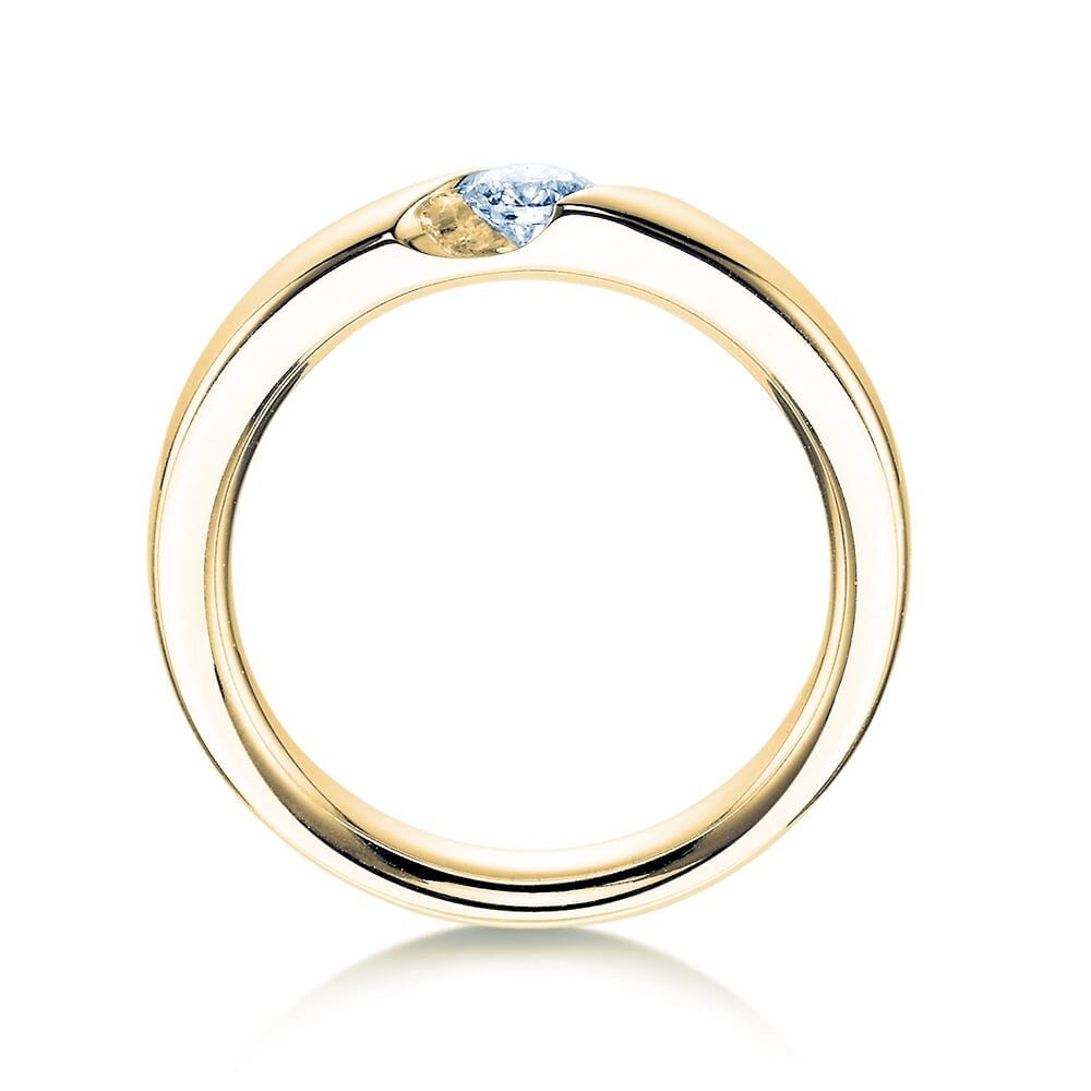 Ein klassischer Spannring, schlicht und elegant. Auf den zweiten Blick offenbart sich seine besondere Raffinesse, die diagonal verlaufende Fassung. Sie gibt dem Diamanten sicheren Halt und sorgt, durch die offen ausgeformten Seiten, für seitlich einfallendes Licht. Der Diamanten beginnt zu strahlen.