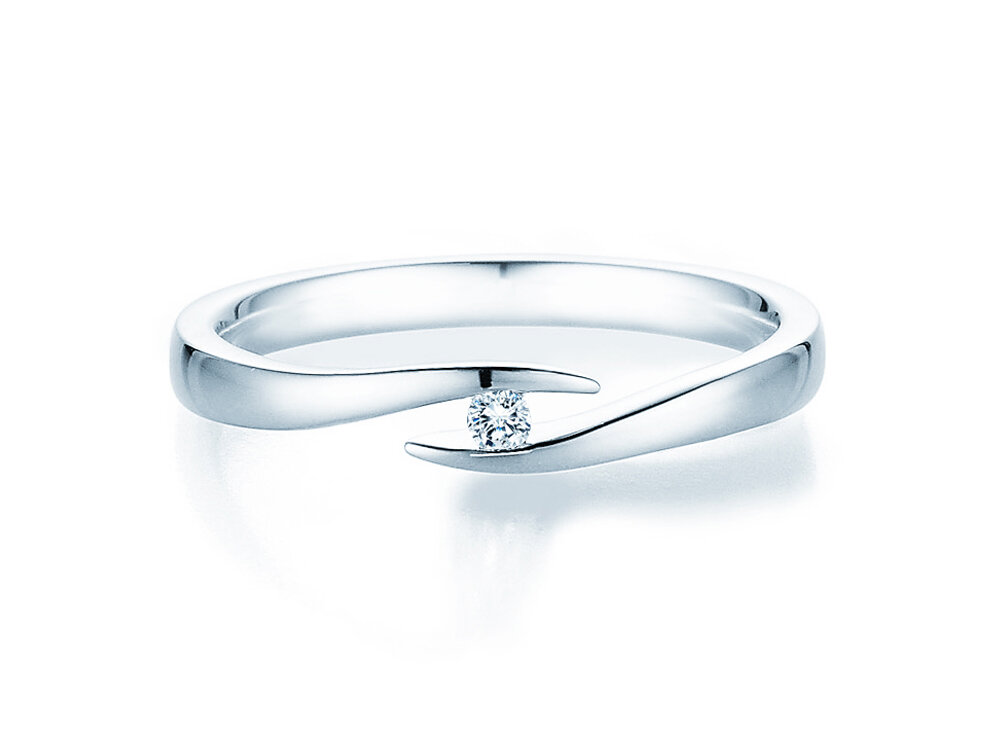 Der Spannring Twist aus modernem Silber mit einzelnem Diamant. Ein schlichter Spannring, ideal für einen gelungenen Antrag. Dieses Modell ist auch in weiteren Metallen und Diamantgrößen verfügbar.